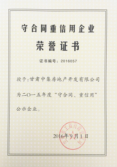 2016年9月1日,由蘭州市工商行政管理局評(píng)選的蘭州市2015年度“守合同重信用公示企業(yè)”對(duì)社會(huì)各界發(fā)布,本次全蘭州市共發(fā)布88個(gè)“守合同重信用公示企業(yè)”。甘肅中集實(shí)業(yè)集團(tuán)有限公司子公司甘肅中集房地產(chǎn)開發(fā)有限公司憑借“重誠(chéng)信、謀發(fā)展”的經(jīng)營(yíng)發(fā)展模式,喜獲蘭州市2015年度“守合同重信用公示企業(yè)”榮譽(yù)稱號(hào),為甘肅中集集團(tuán)發(fā)展里程再添輝煌。