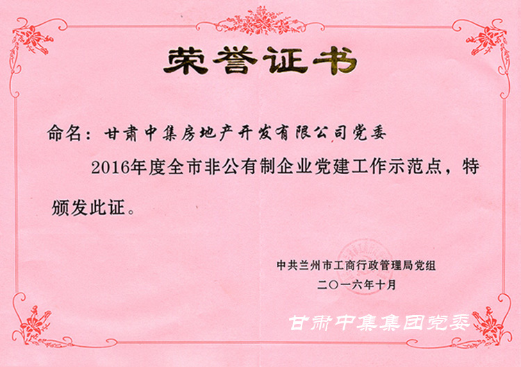 2017年10月10日,由蘭州市工商行政管理局評(píng)選的2016年度全市非公有制企業(yè)“黨建工作示范點(diǎn)”面向全市發(fā)布,甘肅中集房地產(chǎn)開發(fā)有限公司黨支部喜獲全市非公有制企業(yè)“黨建工作示范點(diǎn)”殊榮并獲得由蘭州市非公委補(bǔ)貼黨建專項(xiàng)經(jīng)費(fèi)20000元。