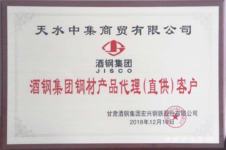 2018年12月12日,由酒鋼集團宏興鋼鐵股份有限公司組織的“2019年酒鋼碳鋼產品推介暨客戶座談會”及“2018年度全國百家金牌供應商頒獎典禮”在蘭州皇冠假日酒店召開。甘肅中集實業(yè)集團有限公司及下屬子公司蘭州中集商貿有限公司、天水中集商貿有限公司榮獲“酒鋼集團鋼鐵產品代理(直供)客戶”及“2018年度金牌代理商”殊榮。